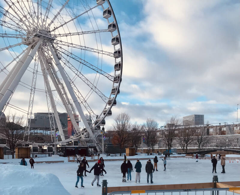 16h30 : Bordée d’un port gelé une grande roue surplombe le reste de la ville gardant à son pied une patinoire naturelle spacieuse. J’ai froid, comment font ces gens pour se couvrir si peu ? Pour réconfort Adrianne m’emmène chez « Erable & Companie » afin de s’offrir « une tire de sirop d’érable » coulée et durcie par la glace devant nos yeux. Comme il fait chaud à l’intérieur du magasin il faut payer avant, et sortir rapidement avant que « le suçon » (la sucette en France) ne fonde. Pas question de perdre un doigt pour une sucette, tant pis pour mes gants si ça coule dessus mais je mangerais tant bien que mal cette sucrerie avec mes gants. Une fois croqué le sirop fond dans la bouche, c’est un délice.