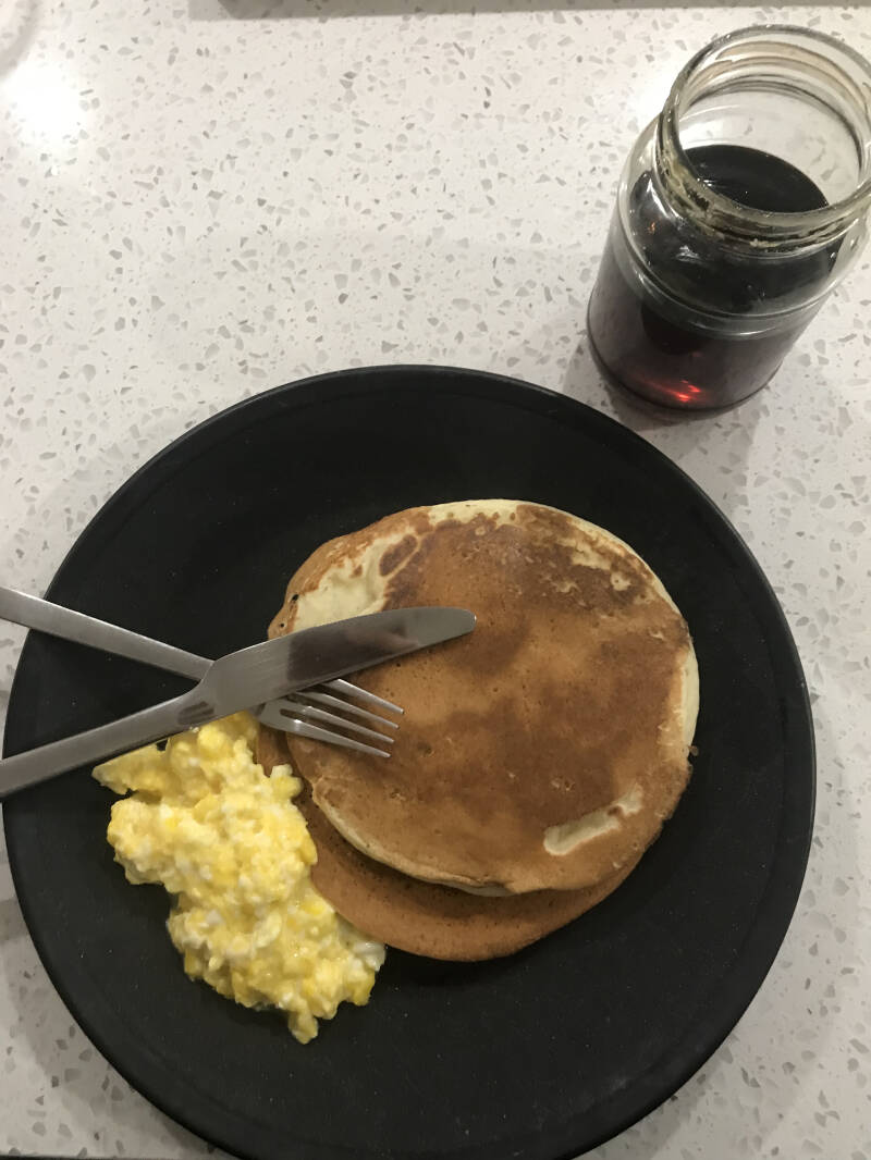9h : Adrianne me dorlote, pendant que j’appelle la métropole elle se décide à me faire un petit déjeuner de champion : pancakes et oeufs brouillés au sirop d’érable. Encore une fois une réussite, pourtant elle ne mange pas avec moi puisqu’ils s’absentent tous les deux en fin de matinée pour bruncher. Le frère de Raphaël leur a offert un brunch /spectacle de gospel pour noël, j’ai hâte qu’elle me raconte.