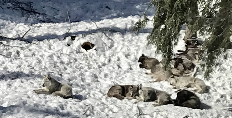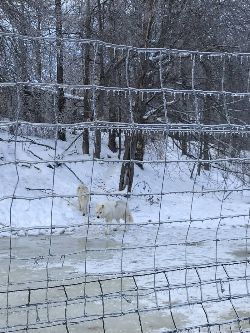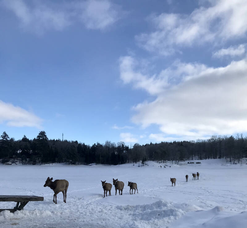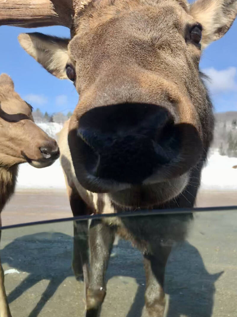 12h45 : Certains sont plus sauvages que d’autre. Les wapitis s’engouffrent par les fenêtres de la voiture, avares de carottes. Les bois de certains représentent un danger pour notre pauvre petite voiture de location mais le moment est trop unique pour s’en priver. A eux s’ajoutent des sangliers, moins commodes mais tout aussi gourmands. La route continue et dans un endroit où la présence humaine est permise je ne réussi par à résister, sors dans ce -8° en pull pour m’approcher des daims et des cerfs. Je vis quelque chose que je ne pensais pas avoir la chance de découvrir un jour. Dans ce décors irréel la neige et la glace ont cristallisés tout le paysage qui m’entoure. Une épaisse couche de froid recouvre le sol à plusieurs kilomètres à la ronde, sur des plaines jonchés d’arbres figé, pris au piège dans ce gel d’hiver, qui fait scintiller chacune de leurs branches. Cette image idyllique donne l’impression que tout a été recouvert d’argent, et brille à travers les rayons du soleil qui accompagne cette journée parfaite. Les loups arctiques, renards argentés, les caribous et écureuils nous offrent leurs plus beaux spectacles, mais aussi les wapitis, les coyotes et les ratons laveurs. Seuls les ours manquent à l’appel. Je présume qu’il fait trop froid pour eux, et qu’à cette période de l’année ils doivent hiberner mais j’espère avoir la chance en jour d’en croiser un. Pas trop près quand même.