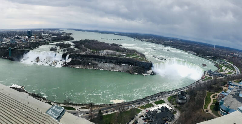 16h30 : La météo était moins magnanime que prévue : pluie, vent, froid. Bref je m’approche quelques minutes pour contempler ces chutes mondialement connues, puis rentre les admirer de l’intérieur bien au chaud. Je passe le reste de mon temps le nez collé à la vitre, comme décors c’est pas trop mal.